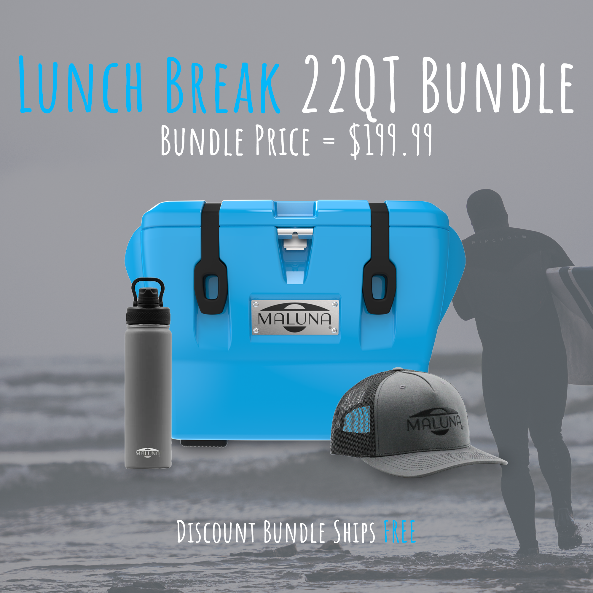 This preset bundle includes a Chill Blue 22 Qt cooler, a 22oz Cool Gray bottle, and a charcoal gray Maluna trucker hat.